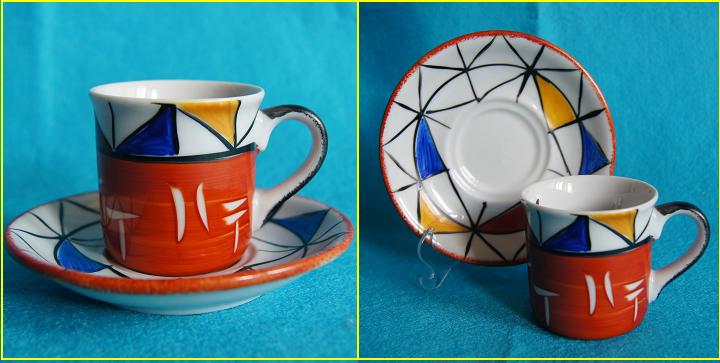 numa xícara enorme, verde, uma xícara de chá que serviria para café. Adquiri